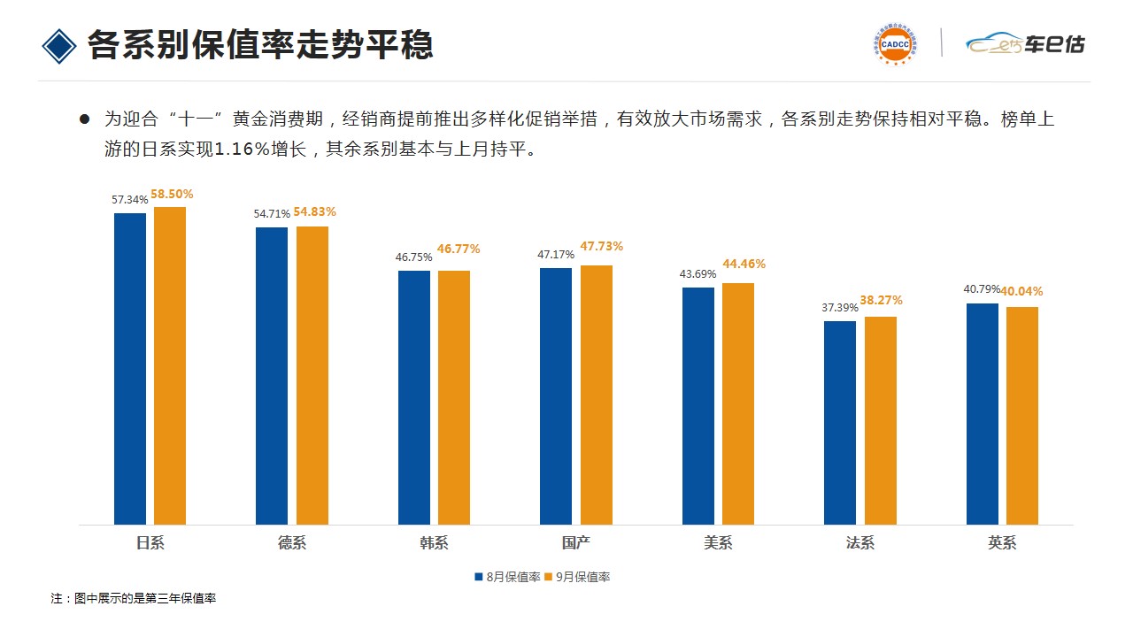 二手车市场与经销商精准把握“十一”消费节点,提前推出降价、金融贴息、置换补贴等促销策略,进一步放大市场需求,各系别保值率整体运行平稳。日系延续上月优势,保值率由57.34%升至58.50%,环比提高1.16%。德系、韩系、国产波动区间均不足0.6%,三者保值率分别为54.83%、46.77%、47.73%。美系、法系分别微涨0.77%、0.88%,英系小幅回落0.75%。