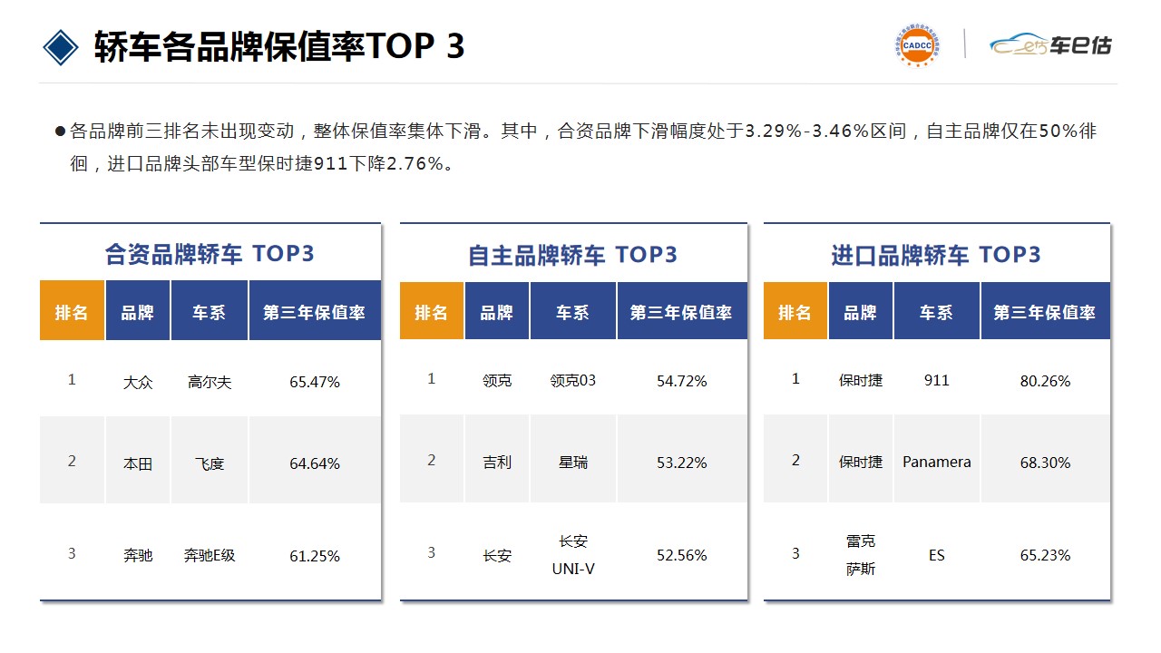 进口品牌轿车保值率前三分别是保时捷911、保时捷Panamera和雷克萨斯ES。三者保值率均有不同程度下降,其中保时捷911下降2.76%,本月保值率为80.26%。相较于榜单第一名,保时捷Panamera和雷克萨斯ES保值率稍低,两者均未突破70%。