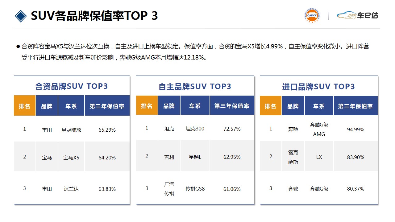 合资SUV榜单,丰田皇冠陆放排名第一,本月保值率为65.29%。宝马X5排名第二,保值率涨至64.20%。作为豪华SUV的代表,宝马X5国产后价格优势凸显,新车市场的热度也带动了二手车市场的需求,保值率随之上升。以高保值率、大空间和低故障率著称的汉兰达,在二手车市场同样备受关注,本月保值率为63.83%。