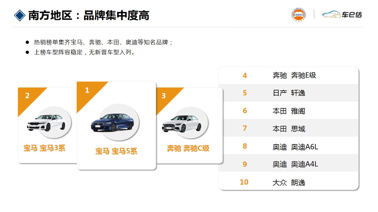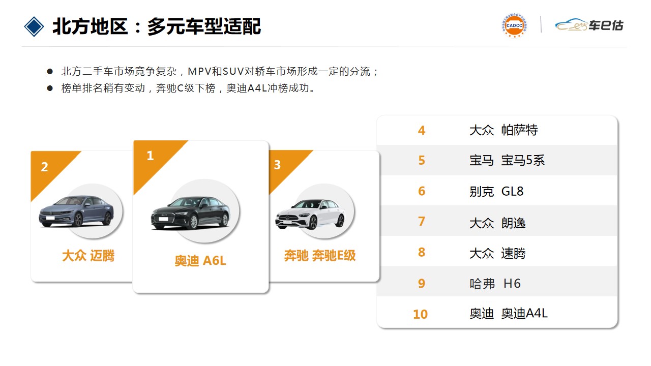 北方二手车市场,车型排名展现出动态变化,上榜多为中高端轿车,也有MPV和SUV车型。前三车型中,奥迪A6L与大众迈腾仍保有第一、第二的位置。上月的热销季军大众帕萨特,本月排名下滑至第四。奔驰E级摘下榜单第三的位置,宝马5系上升一个名次至第五,别克GL8名次降至第六。大众朗逸和速腾分别排名第七和第八,这两款车型价格相对亲民,销量一直较为可观。哈弗H6位列第九,庞大的用户群体为其二手车市场提供了充足的车源,使其频频上榜。奥迪A4L分列第十,由于入门级豪华车市场竞争激烈,消费者在选择时更为谨慎,其排名相对一些中端车型略低。
