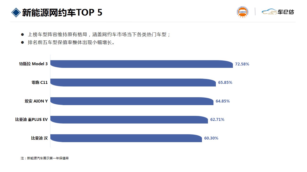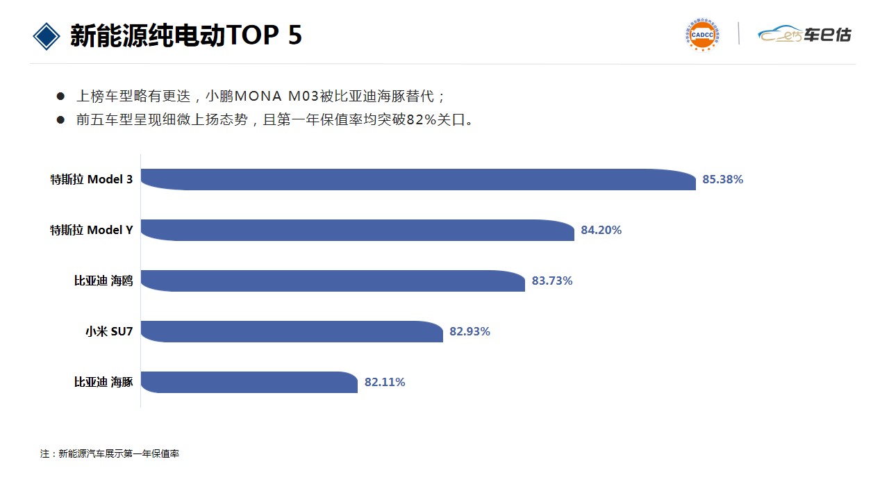 纯电动车领域,特斯拉Model 3和Model Y这两款车凭借强大的品牌号召力以及领先的自动驾驶技术,在二手车市场备受追捧,高流通性为其保值率的稳定提供了有力支撑。二者保值率与上月基本持平,维持在85%左右。排名第三的比亚迪海鸥以极高性价比成为城市代步热门之选,保值率达83.73%。市场热度极高的小米SU7本月排名第四,保值率较上月有小幅提升,达到82.93%。此外,比亚迪海豚小巧灵活的特性十分契合城市出行需求,在二手车市场拥有稳定的受众群体。本月取代小鹏MONA M03进入榜单,保值率为82.11%。