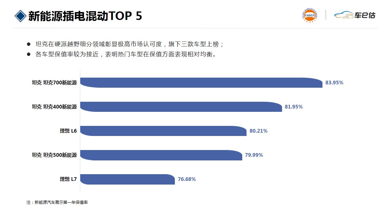 上月首度跻身榜单的坦克品牌,本月强势领跑,一举占据榜单多个席位。旗下坦克700新能源、坦克400新能源、坦克500新能源分列榜首、第二和第四名,保值率表现亮眼,依次为83.95%、81.95%、79.99%。该品牌大放异彩,得益于其搭载的先进电池技术,既赋予车辆强劲动力,又有效降低油耗。同时,日系品牌硬派越野车逐步退出中国市场,也为坦克品牌创造了更广阔的发展空间。而精准聚焦家庭用户市场的理想L6、L7,本月排名分别降至第三和第五,保值率分别为80.21%、76.68%。